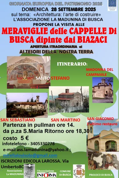 Domenica 28 settembre, in occasione delle Giornate Europee del Patrimonio 2025, l’Associazione La Madunina di Busca organizza un pomeriggio speciale dedicato alla scoperta delle cappelle buschesi affrescate dai fratelli Biazaci.