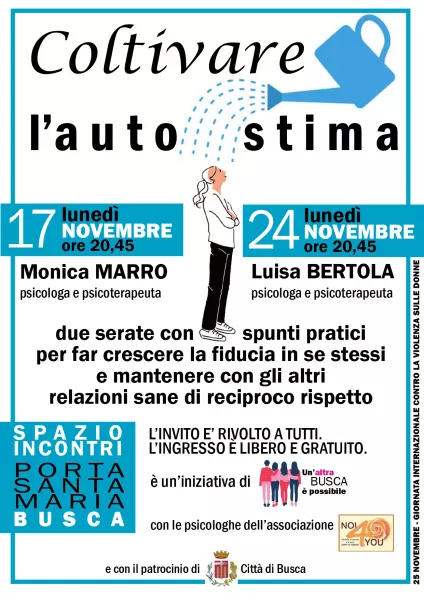Lunedì 17 e 24 novembre alle 20.45 nello Spazio Incontri Porta Santa Maria, si terranno due serate dedicate al tema dell’autostima, argomento già affrontato lo scorso marzo insieme alle psicologhe dell’associazione Noi4You Cuneo.