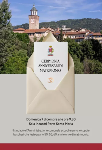 Domenica 7 dicembre ore 9.30 presso la Sala Incontri Porta Santa Maria, il sindaco e l'Amministrazione comunale accoglieranno le coppie buschesi che festeggiano 50, 55, 60 anni e oltre di matrimonio per celebrare insieme la ricorrenza e per consegnare loro una targa ricordo.