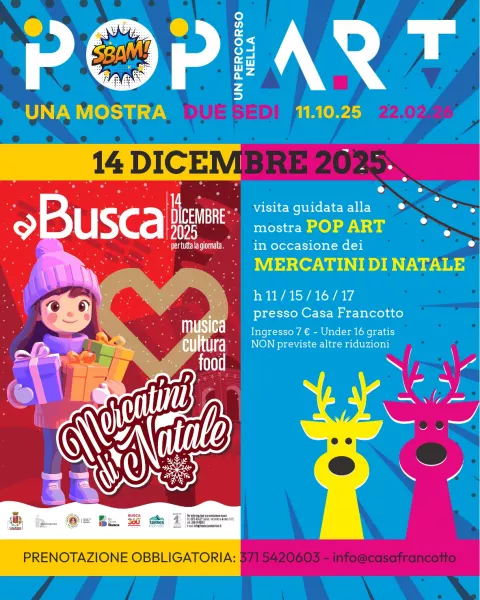 In occasione del mercatino di Natale che si terrà nelle vie del centro cittadino di Busca domenica 14 dicembre 2025, la mostra sarà aperta dalle 10 alle 12 e dalle 14,30 alle 18,30. Saranno disponibili, su prenotazione, visite guidate incluse nel biglietto d’ingresso (in via del tutto eccezionale 7€ a persona) nei seguenti orari 11, 15, 16 e 17 per accompagnare il pubblico alla scoperta degli artisti che hanno rivoluzionato l’arte contemporanea.