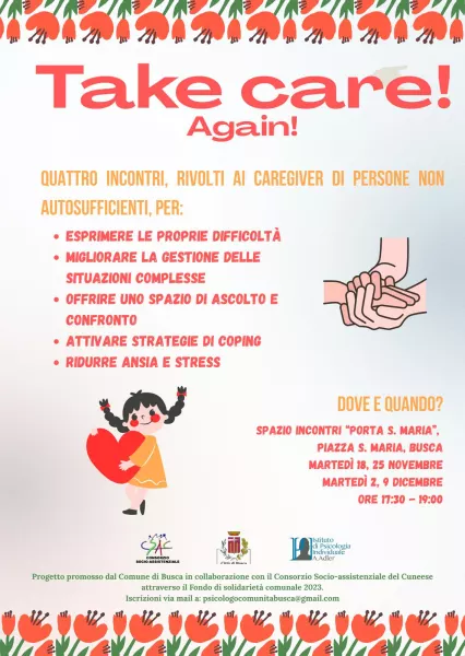 L’iniziativa, intitolata “Take Care! Again”, intende offrire supporto a chi ogni giorno si prende cura dei propri cari: uno spazio sicuro dove condividere difficoltà, migliorare la gestione delle situazioni complesse, attivare strategie di coping e ridurre ansia e stress.