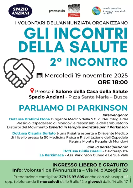 Prosegue il ciclo “Gli incontri della salute” promosso dai Volontari dell’Annunziata. Il secondo appuntamento sarà dedicato al morbo di Parkinson, per approfondirne aspetti clinici, riabilitativi e strategie di supporto.