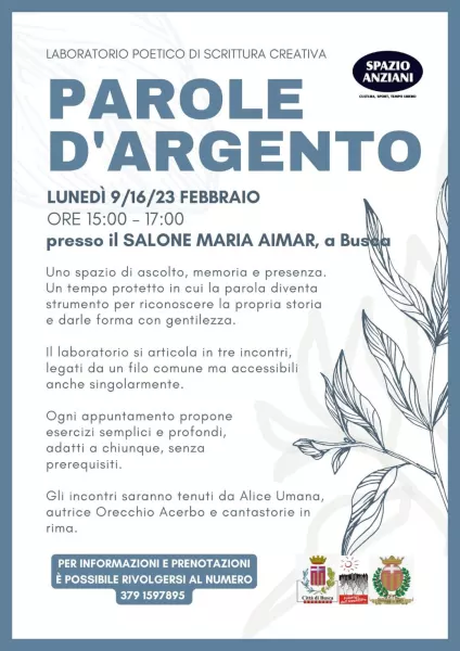 Prende il via a Busca “Parole d’Argento”, laboratorio poetico di scrittura creativa promosso da Spazio Anziani, in programma lunedì 9, 16 e 23 febbraio, dalle ore 15.00 alle 17.00, presso il Salone Maria Aimar.