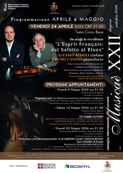 Due interpreti di fama internazionale, appartenenti a generazioni diverse ma con un filo conduttore che sancisce un sodalizio artistico di alto livello, la musica: il duo formato da Alessio Bidoli al violino e Bruno Canino al pianoforte, saranno protagonisti venerdì 24 aprile alle ore 21.00 al Teatro Civico di Busca. Il concerto, dal titolo “L’Esprit Français: dal Salotto al Blues”, accompagnerà il pubblico nella Francia tra Otto e Novecento attraverso le sonate di Poulenc, Saint-Saëns e Ravel.