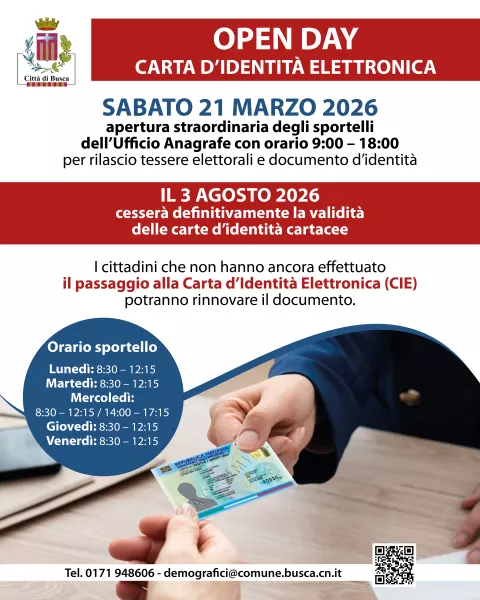 Sabato 21 marzo, in vista del referendum del 22 e 23 marzo, l’Ufficio Anagrafe del Comune di Busca garantirà l’apertura straordinaria degli sportelli dalle ore 9.00 alle ore 18.00. In questa occasione, i cittadini che non hanno ancora effettuato il passaggio alla Carta d’Identità Elettronica (CIE) potranno rinnovare il documento.