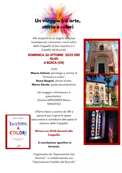 Organizzato dall'associazione San Quintino in collaborazione con l'associazione Castello del Roccolo domenica 26 ottobre sarà possibile scoprire un affascinante angolo buschese per conoscere i nuovi colori della Cappella di San Quintino, recentemente restaurata, e il Castello del Roccolo, tripudio di colori nelle sue sale e nei suoi affreschi.