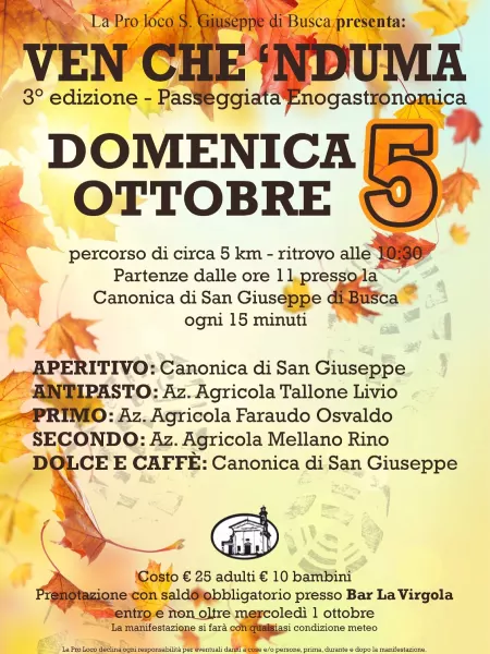 Domenica 5 ottobre la Pro Loco di San Giuseppe di Busca organizza la terza edizione di “Ven che ‘Nduma”, passeggiata enogastronomica lungo un percorso di circa 5 km.